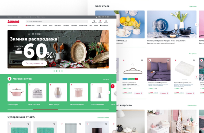 Домовой — одна из крупнейших сетей супермаркетов в Санкт-Петербурге и Москве по продаже товаров для дома. Перед нами стояли задачи по созданию современного дизайна, сокращению пользовательского пути к нужным категориям товаров и увеличить конверсию за счет UI/UX редизайна. О том, что из этого вышло читайте в нашем кейсе.